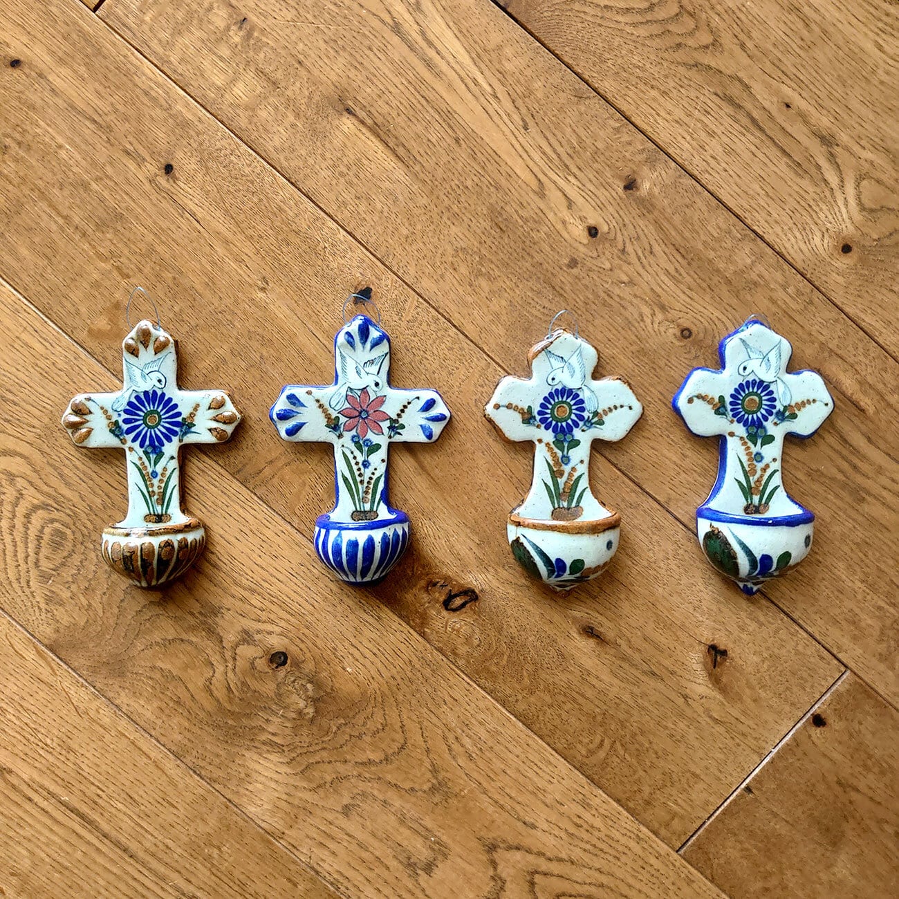 【小鳥のクロス】ソル・ロホ陶器工房/トナラ/ハリスコ/トナラ焼/Ceramica de Alta Temperatura/陶器/聖水盤/鳥/十字架/クロス